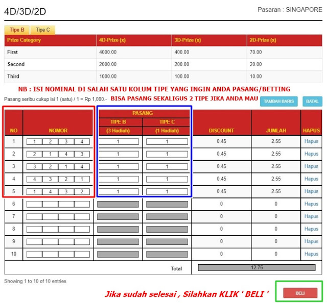 Untuk memasang atau bermain 4D / 4 angka, pada kolom kosong langsung ini saja 4D / 4 angka yang ingin dipasang, contohnya adalah Anda ingin memasang angka 1234, lihat gambar di atas, langsung saja isi angka 1234 dan di bagian kolom 4D jika ingin memasang sebesar Rp 50.000,- maka cukup isi kolom dengan nominal 50, lihat gambar di atas. Review Cara Pasang Togel Bet Diskon#togel #togelonline #d #togelhongkong #prediksitogel #togelsydney #togelsingapore #judionline #bandartogel #togelsgp #toge.